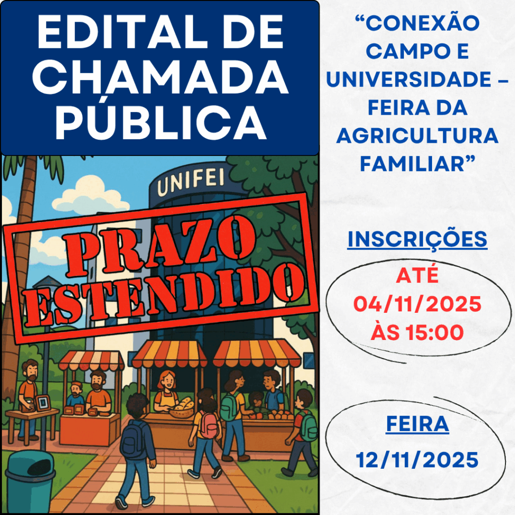 “Conexão Campo e Universidade – Feira da Agricultura Familiar” Durante a VII Jornada Universitária em defesa da Reforma Agrária popular – JURA Data e horário da Feira:12/11/2025 (quarta-feira), das 09h às 19h. Endereço: Áreas internas e externas do salão de apoio da reitoria da Universidade Federal de Itajubá – Campus Prof. José Rodrigues Seabra (Av. […]